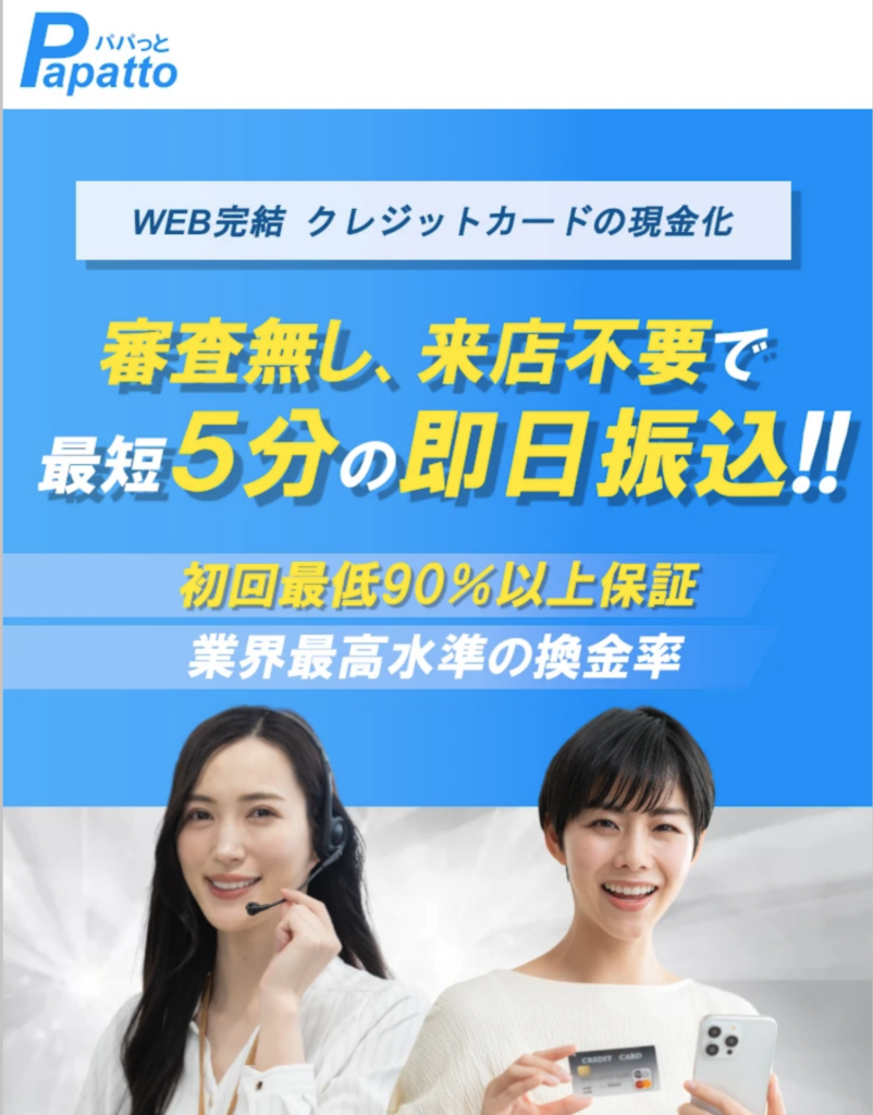 審査なし、来店不要かつ最短5分で即日振込!WEBで完全完結できるクレカ現金化サービスを提供するPapatto(パパっと)。 名前の通り、パパッとできる簡潔さと初回最低90%以上を保証した高換金率が人気で利用者が急上昇中!
